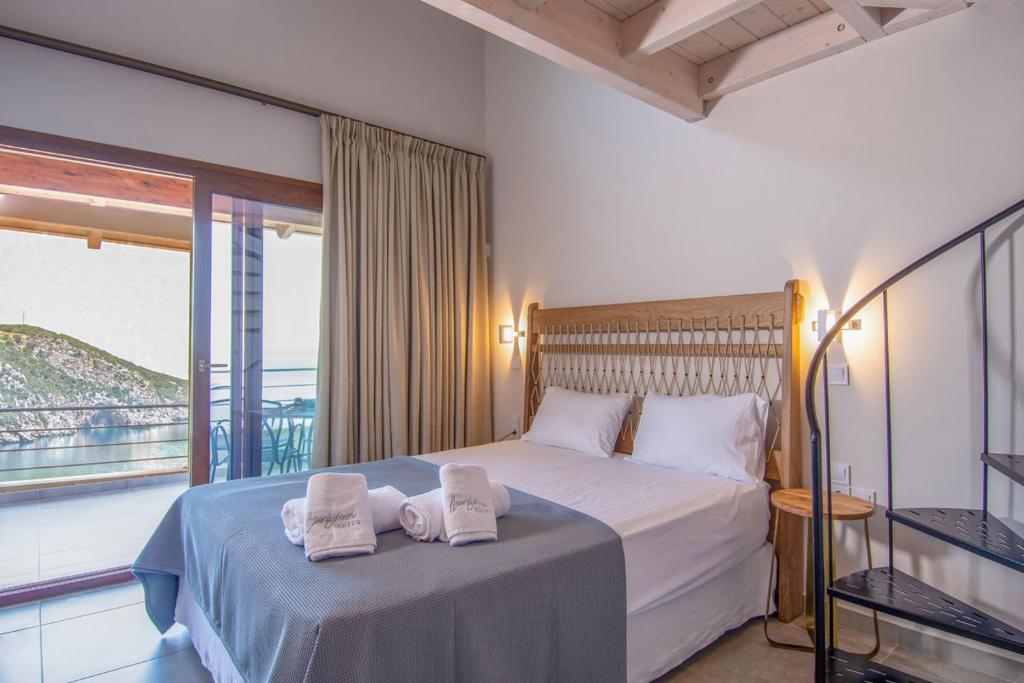 Πέντε άνετες κατοικίες σκαρφαλωμένες στον βράχο του γιαλού, βουτηγμένες στο γαλάζιο του Αιγαίου και την μυρωδιά του φασκόμηλου.