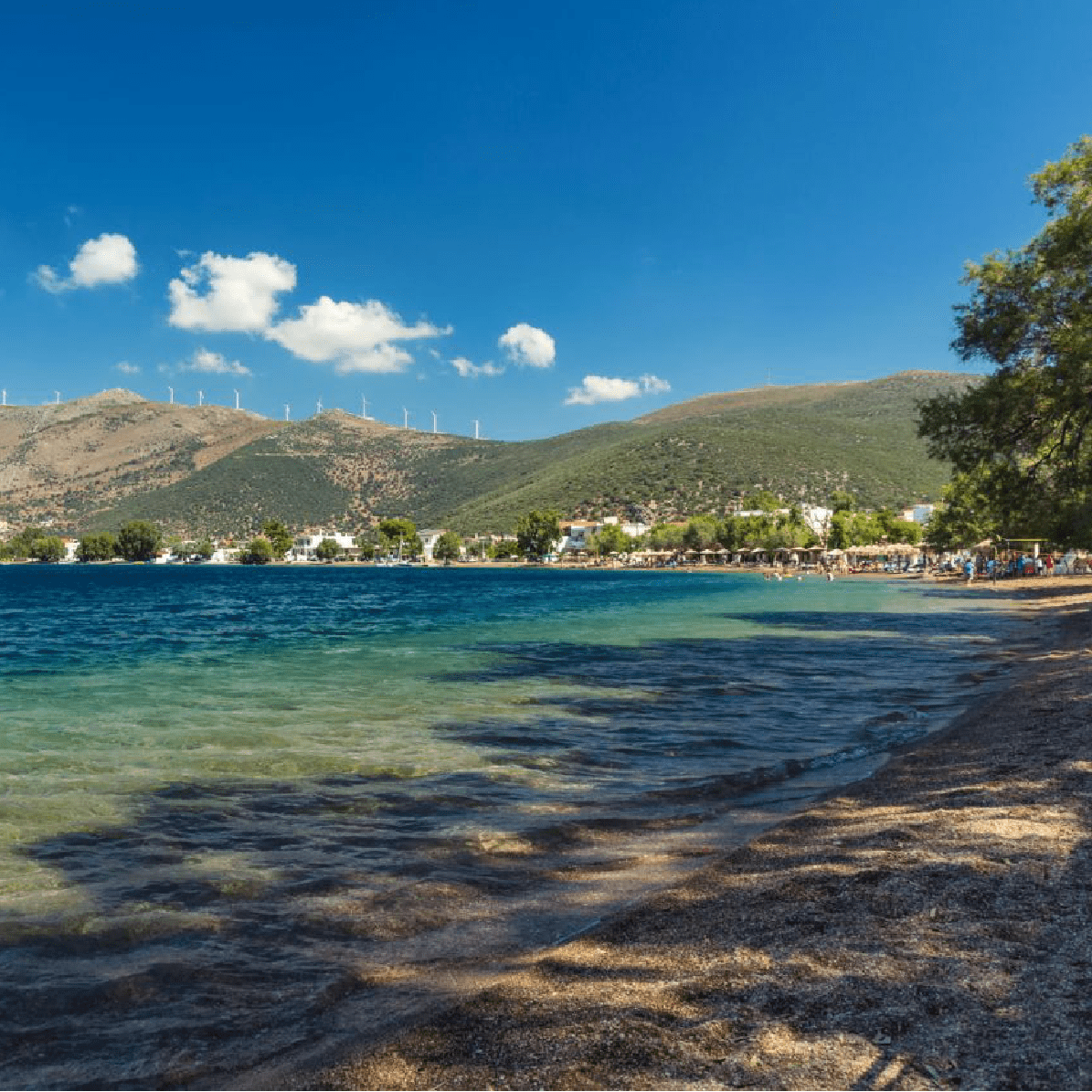 Η παραλία Αλμυροπόταμος είναι μια παραλία γεμάτη καφετέριες, ταβέρνες και έχει αρκετό κόσμο τους καλοκαιρινούς μήνες. Η πλαζ έχει άμμο όπως και ο βυθός. Εάν θελήσετε να διανυκτερεύσετε υπάρχουν ξενοδοχεία και ενοικιαζόμενα δωμάτια. Αν συνεχίσετε τον παραλιακό δρόμο, θα φτάσετε σε μια άλλη παραλία που ονομάζεται Γαλάζια Λίμνη επειδή μοιάζει ακριβώς έτσι. Είναι μια πολύ μικρή παραλία με ένα beach bar.